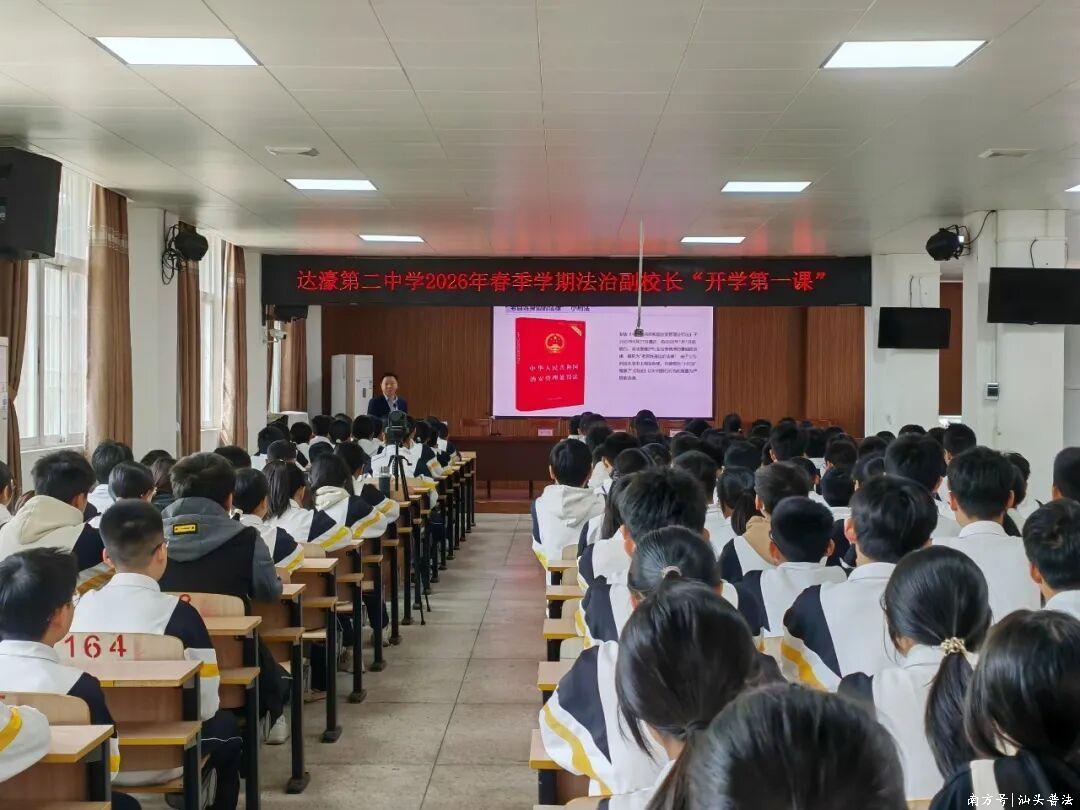 春风如约而至,少年奔赴新程,新学期承载新希望。为增强青少年法治意识,提高学生的自我保护能力,助力平安校园建设,3月9日,汕头市濠江区司法局社区矫正股负责同志(聘任达濠第二中学法治副校长)为同学们带来一场别开生面的“开学第一课”法治讲座。全校1500余名师生通过“现场+直播”同上一堂法治公开课。